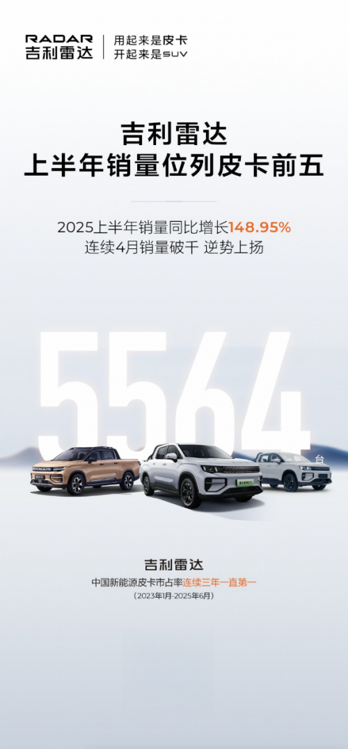 国内皮卡市场迎来重要里程牌。最新数据显示,吉利雷达以5564台的半年度销量成绩,实现同比148.95%的爆发式增长,强势跻身皮卡市场销量前五,更成为前五阵营中唯一新能源皮卡品牌,以“黑马”之姿改写传统燃油皮卡主导的市场格局。