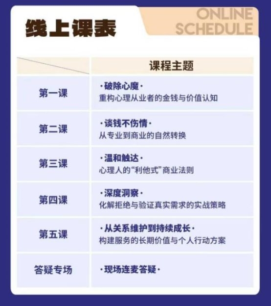 课程通过5节干货课程与1场专属答疑专场,为学员构建起一套系统且实用的能力提升体系。从认知重构起步,旨在破除心理从业者对于金钱与价值的固有偏见,重塑“专业服务即创造价值”的正向认知;继而深入探索从专业到商业的自然转换路径,解析心理人的“利他式”商业法则,让商业转化不再是生硬的技巧堆砌,而是专业能力的自然延伸;同时,还聚焦实战策略,传授化解服务拒绝、验证真实需求的有效方法,最终帮助学员搭建起服务长期价值与个人发展的行动框架,实现“专业—商业”闭环的一站式打通。