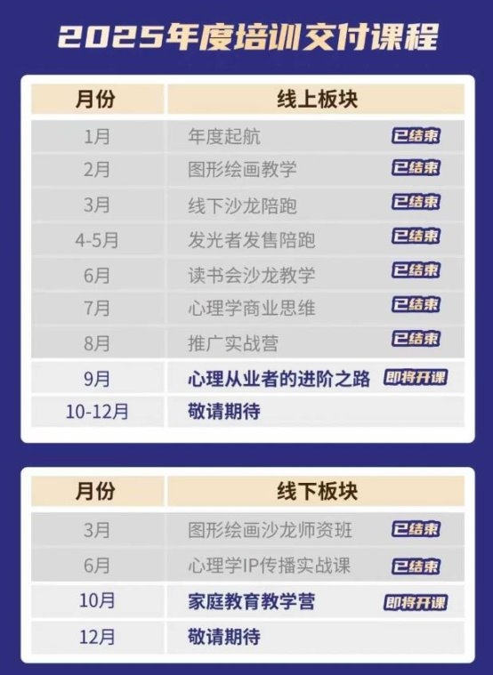 回溯“幸福心理商学苑”的发展脉络,其作为灵动生活集团旗下幸福研习社的核心板块,始终以推动心理行业专业化、产业化发展为己任。2025年度,商学苑构建了更为完善的培训矩阵,线上板块涵盖年度起航、图形绘画教学、线下沙龙陪跑等多元内容,全面覆盖心理从业者成长的各个维度;线下板块则布局了图形绘画沙龙师资班、心理学IP传播实战课、家庭教育教学营等精品项目,为从业者提供从专业提升到品牌塑造的全链条支持。