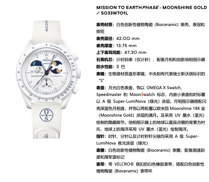 表盘与表冠上骄傲饰有 OMEGA X Swatch 联名标志,表壳背面刻有使命宣言。电池盖设计风格灵感来自地球,白色 VELCRO® 橡胶表带增添时尚气息。